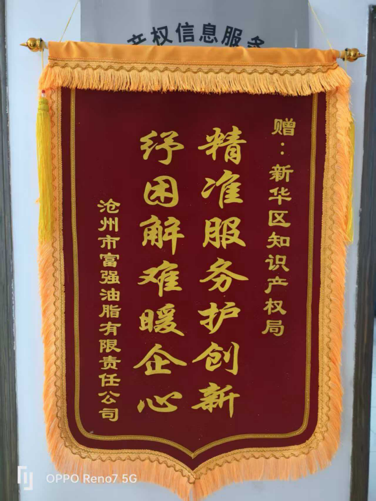 新年伊始,暖意融融。沧州市富强油脂有限责任公司负责人专程到访新华区知识产权局,将一面印着“精准服务护创新 纾困解难暖企心”的锦旗郑重赠予工作人员,以此向该局长期以来在知识产权全链条工作中给与的专业指导与贴心帮扶,表达深深的谢意。