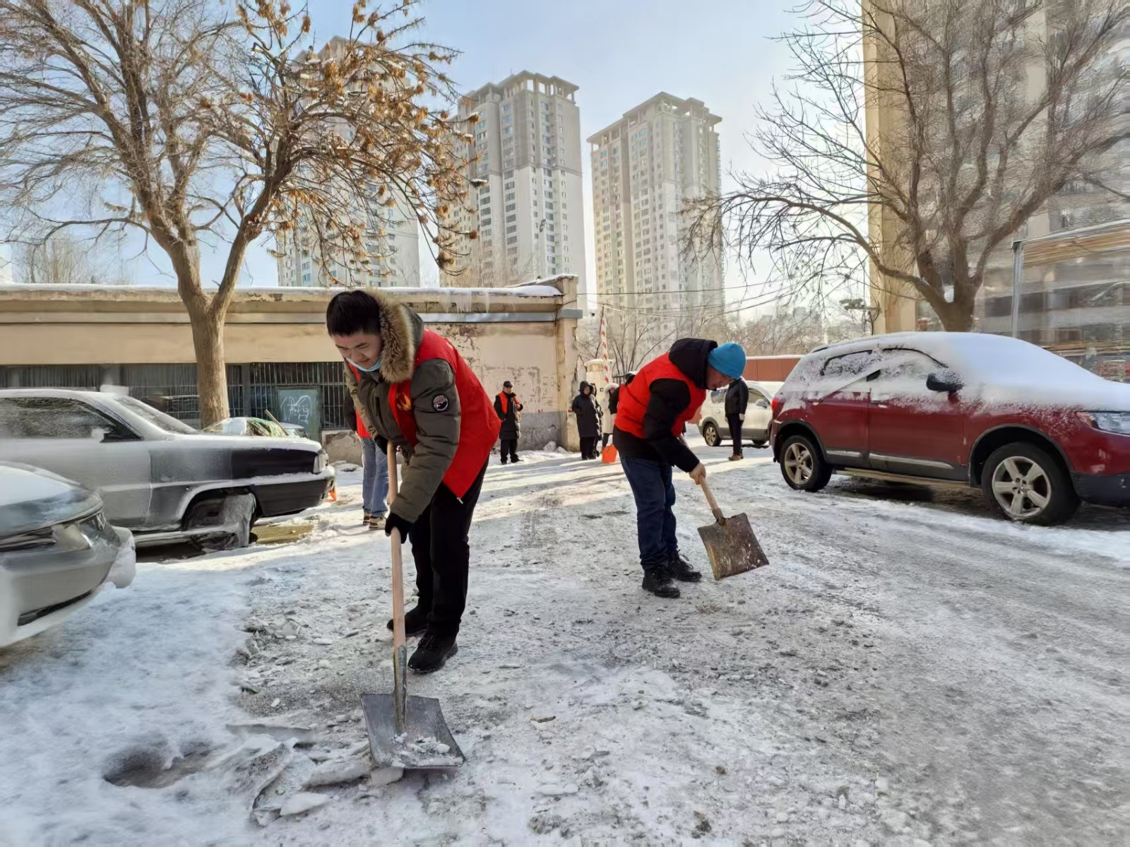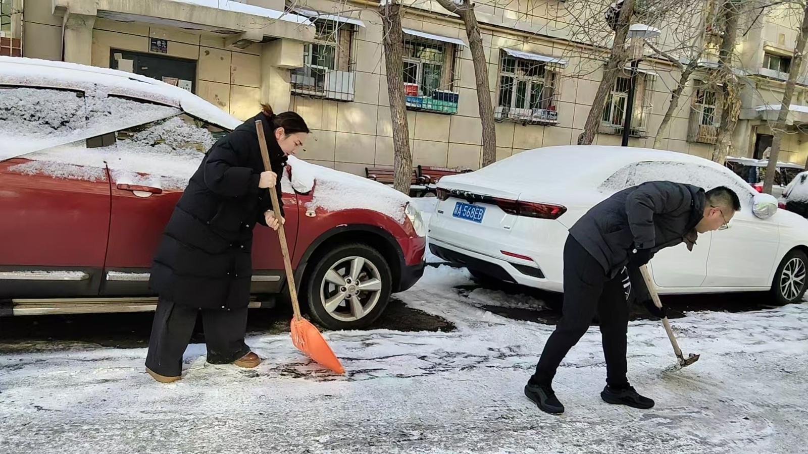 活动前,社区与工作队提前制定整治方案,明确人员分工与作业范围,配备铁锹、扫帚、除雪铲等工具,确保活动高效推进。活动现场,全体人员身着志愿服装,以饱满的热情投入到清雪工作中。大家自发分成多个小组,有的用铁锹铲除路面硬冰,有的用扫帚清扫松散积雪,有的将清理后的积雪搬运至指定区域,还有的对家属院角落的杂物进行同步清理。社区书记刘扬、工作队第一书记阿达力别克·玛纳甫汉带头冲锋在清雪一线,与干部们并肩作战,即便双手冻得通红、额头渗出汗水,也丝毫没有懈怠。针对家属院内老年居民较多、出行不便的特点,工作人员重点对单元门口、坡道等关键区域进行反复清理,确保无残留积雪、无结冰隐患。