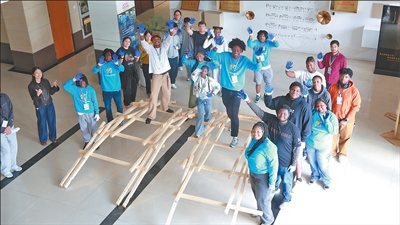 访华期间,美国青少年教育交流团访华师生现场感受到中国蓬勃的创新活力。他们走进常州市北郊高级中学,与中国学生进行课堂交流,与科创工作室成员互动,体验了鲁班桥搭建(见图,江苏省教育国际交流服务中心供图)等传统工程与现代科学融合项目。他们还参访了常州大学、常州理想汽车智能制造基地等,深入了解中国在科技创新,特别是新能源领域的发展。