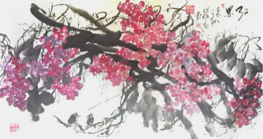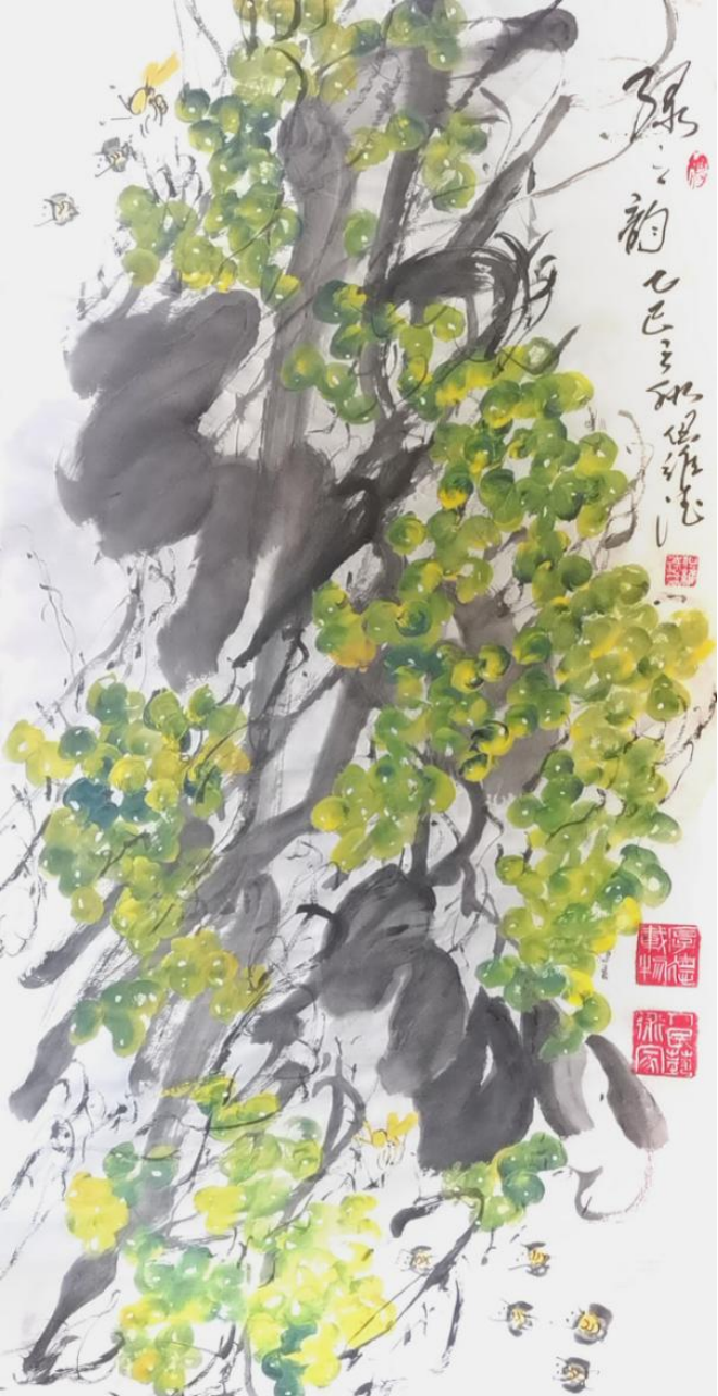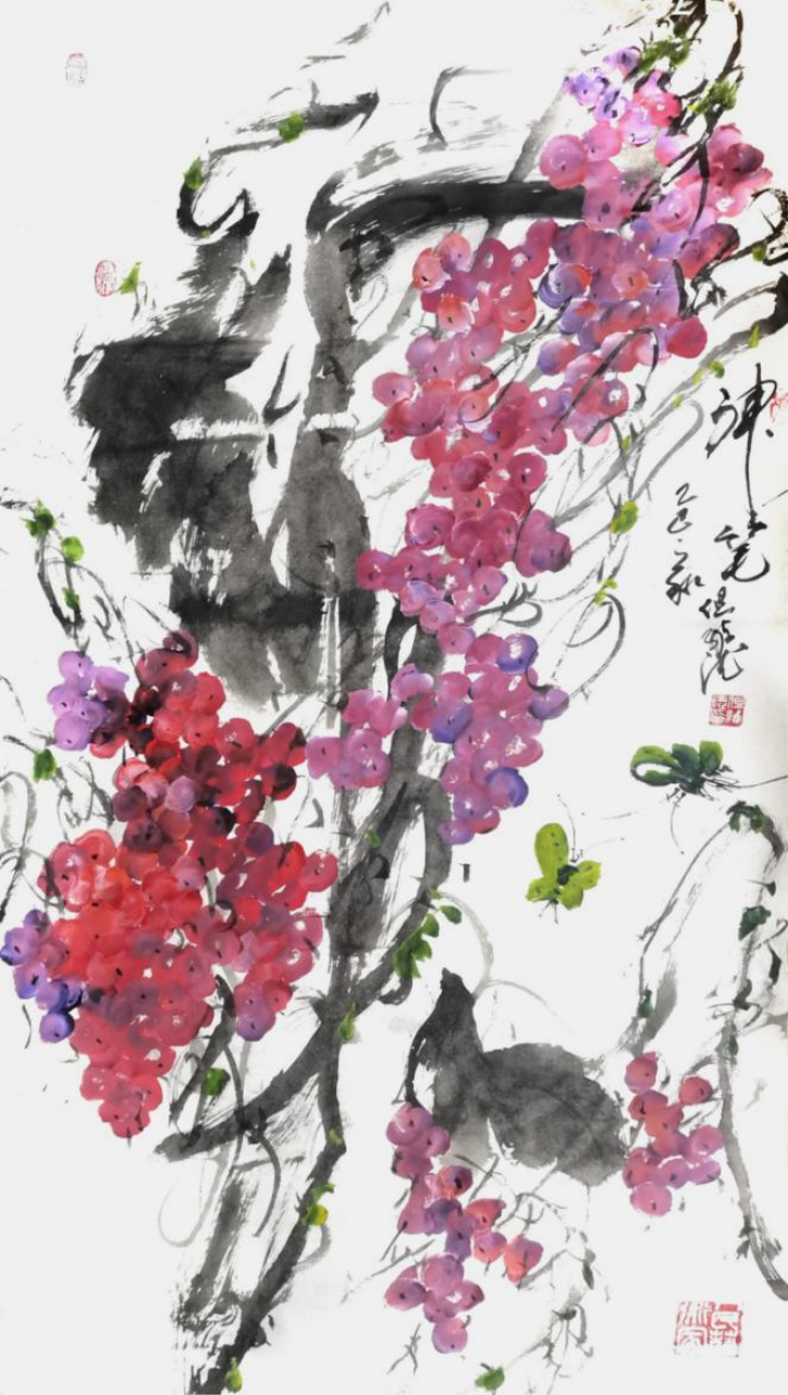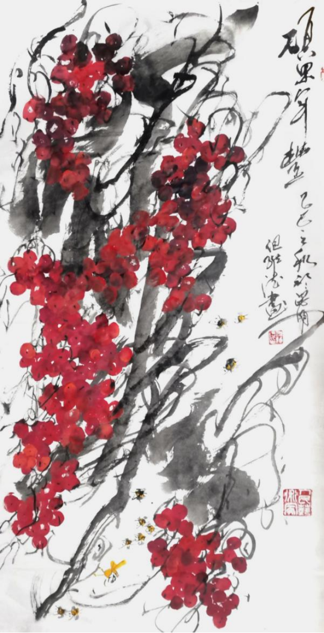 而但老师的书法作品,更是令人拍案叫绝。每一笔一划,都力透纸背,彰显出老师深厚的书法造诣。他的字体,既承袭古风,又独具个性,既古朴凝重,又灵动洒脱。在老师的笔下,每一个字都仿佛被赋予了生命,它们或跳跃、或沉静,共同演绎着一场视觉与心灵的盛宴。此外,但维德老师的果木画作也同样令人赞叹。他笔下绘出的葡萄栩栩如生,仿佛能够闻到果香,感受到生命的脉动。但老师在描绘这些果木时,不仅注重形态的逼真,更注重神韵的传达,使得每一幅作品都充满了生机与活力。