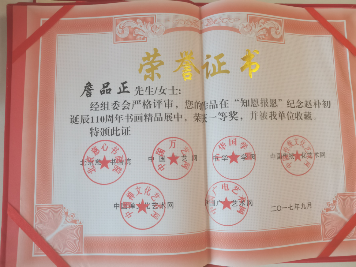 2017年9月书法作品在“知恩报恩”纪念赵朴初诞辰110周年书画精品展中,荣获一等奖,作品被主办单位收藏。