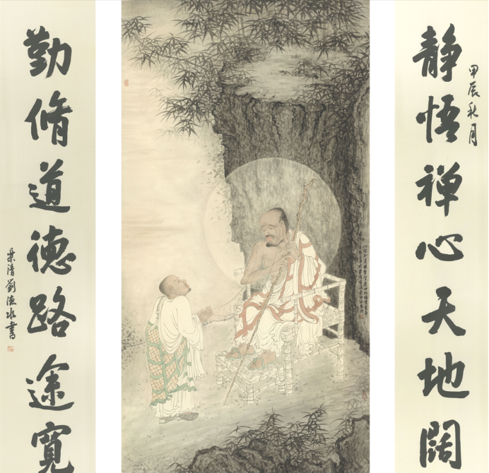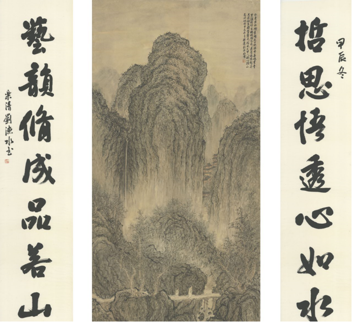 郭熙《林泉高致》有言:“山水有可行者,有可望者,有可游者,有可居者。” 此境恰是刘德水画作的鲜活注脚。其团扇小品《溪居坐隐》以流畅线条勾勒茅亭流水,方寸间营造 “可卧游可神居” 的林泉佳处,观者如闻松涛漱石之声;青绿山水《携琴访友图》则融雄健笔墨与清雅色调,石之坚硬、树之挺拔皆随节奏生发,点景人物虽寥寥数笔,却藏 “相见亦无事,不来忽忆君” 的文人意趣。这种逸气源于其 “山水即心象” 的认知,更根植于深厚的文人积淀。他曾与孙郁合编张中行研究著作,耗时整理《张中行著作系年》,于中行先生 “士之精神与平民化” 的文风中汲取养分;与启功先生交往甚密,对其 “不知多于知” 的谦抑治学观体悟尤深,启功为其题写的联语,早已化作他笔墨中的清灵之气。故《书中云烟》中亭下观书者与飞瀑林峦相融,遂成 “智者息心,闲和之趣顿生” 的化境,恰合 “文心映画心” 的古训。