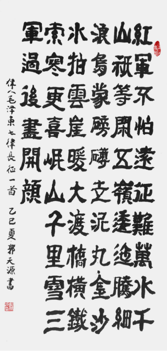 多年来,郭天源先生坚守书法艺术初心,注重红色文化与书法艺术的融合传承。2025 年中秋,其作品入选由湖南文人书画院主办的 “纪念毛主席《七律长征》创作 90 周年暨红军长征胜利 90 周年全国书画交流展”,并获颁 “中华红色功勋艺术家” 荣誉称号,以笔墨致敬长征精神,传递红色文化力量。
