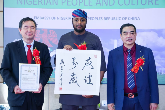 “新时代毛体书法”艺术家于泽军致答谢词。他首先感谢中名联国际和尼日利亚驻华大使馆搭建平台,使他能够把“新时代毛体书法”艺术作品传播到非洲最大的国家尼日利亚,增进世界文化繁荣和发展。随后,进一步介绍了“新时代毛体书法”的艺术特色。最后将自己专门为此次纪念中尼建交54周年而创作的“新时代毛体书法”艺术作品——《友谊万岁》赠送给尼日利亚驻华大使馆。大使馆商务参赞阿卜杜拉希·乌巴林吉姆当场向于泽军颁发了展览证书。