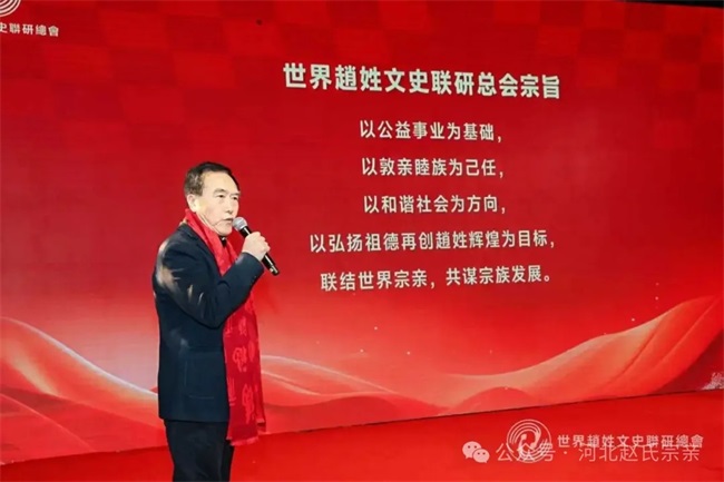 总会常委,河北会长趙洪利首先对总会及创会趙明主席的支持和鼓励表示感谢,并表示将带领河北分会认真贯彻执行总会宗旨,一如既往的做好家族事务!随后作了宗亲会年度工作汇报。他系统梳理了过去一年在宗亲联络,文化传承,公益慈善及组织建设等方面取得的丰硕成果,并围绕"凝聚亲情,共谋发展"的主题,擘画了新一年的工作规划与美好愿景。
