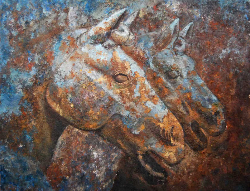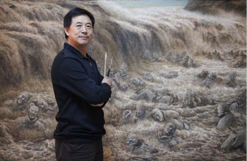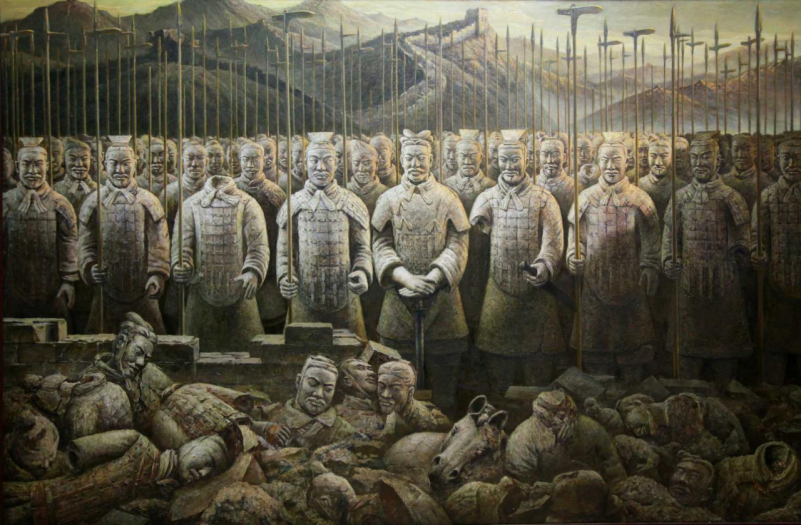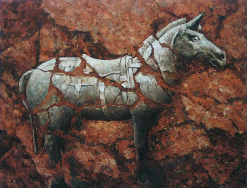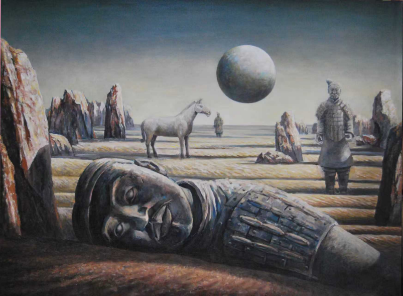 在油画创作方面,孙永印的笔触同样聚焦于历史与军旅题材。从早期作品《行军路上》到后续的《破土》《死生之地》,他始终以沉郁凝重的笔调表现军人精神与历史沧桑。“秦俑系列”是其绘画艺术的代表性成果,代表作《沉积》等作品通过厚重斑驳的肌理与苍茫的色彩,赋予沉睡千年的陶俑以生命与记忆,引发对历史与文化的深层思考。其油画多次入选全国美展、全军美展,并获得国际艺术博览会奖项。作品被海内外多家机构及藏家收藏。