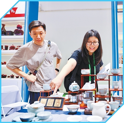 参展人员在国潮出海展区选购景德镇陶瓷。本报记者 蒋雨师摄