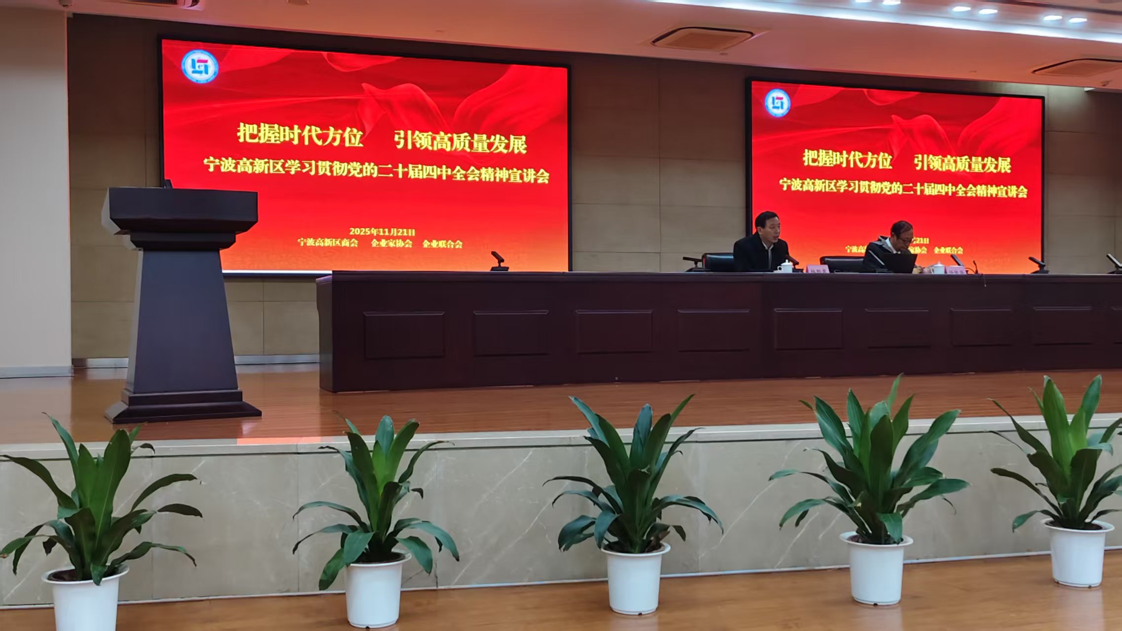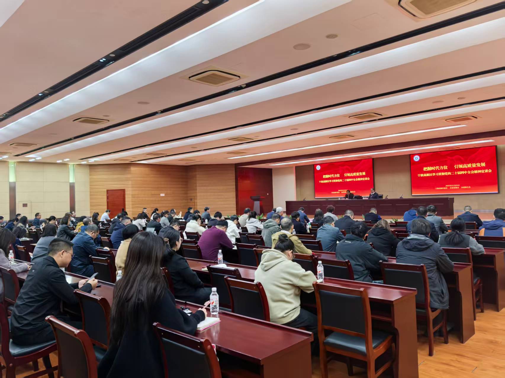为深刻领会党的二十届四中全会的重大意义与战略部署,引导广大企业准确把握国家治理现代化的深刻内涵与发展机遇,2025年11月21日下午,由宁波高新区商会、企业家协会、企业联合会(以下简称“三会”)主办的“把握时代方位 引领高质量发展——深入学习贯彻党的二十届四中全会精神”专题讲座在高新区政务服务中心成功举行。本次活动特邀中央党校(国家行政学院)创新工程首席专家、博士生导师任俊华教授担任主讲嘉宾,高新区管委会一级调研员林贻泉主持会议,区内90多位企业代表参加学习。
