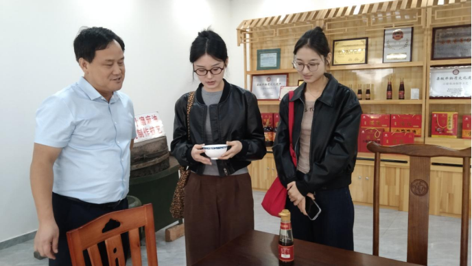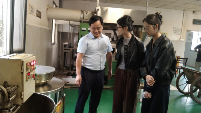 在梅冲益香粮油公司,调研团队细致观摩了小磨麻油的传统制作工艺流程,并就其历史渊源、技艺特点、传承现状以及市场推广等情况,与企业负责人及非遗传承人进行了座谈。同学们对该公司在坚守传统工艺精髓的同时,积极探索市场化路径,使老技艺焕发新生机的做法表现出浓厚兴趣,并围绕非遗品牌建设、传播策略等提出了专业见解。