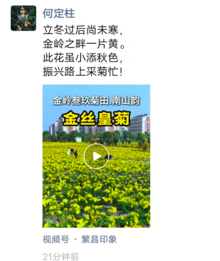 《中华英才》半月刊网安徽讯(俞乃思) 立冬虽过,暖阳依旧。安徽省芜湖市繁昌区孙村镇党委书记何定柱在获悉本镇金岭社区40亩金丝皇菊喜获丰收、绽放成“致富花”的消息后,心潮澎湃,凝神片刻,欣然提笔赋诗一首,分享至朋友圈,以诗抒怀,以文铭志,传递出乡村振兴路上的炽热情怀与坚定信心。