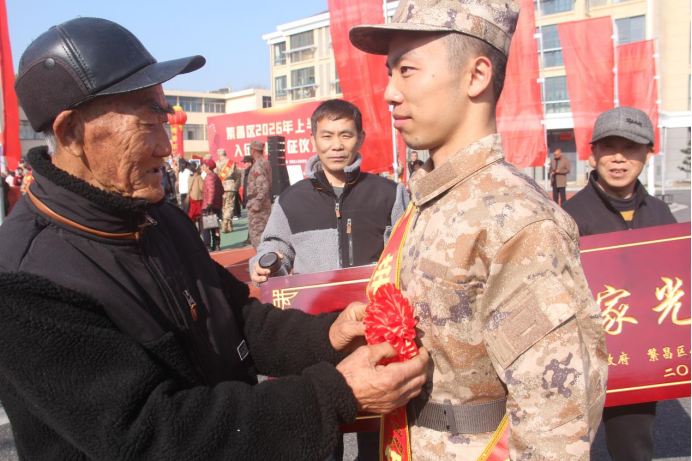俞时金老人站在新兵队伍旁,伸手轻轻抚摸着孙子俞淏胸前的大红花。老人是九连村九连麒麟灯会的省级非遗传承人,平时热心公益,为家乡乡村振兴出了不少力。今天,他的身份是送孙参军的爷爷。队伍即将出发,老人没多说,只是拍了拍孙子的肩膀。俞淏挺直腰板,朝爷爷点点头。这一送,是把自家的孩子交给国家。