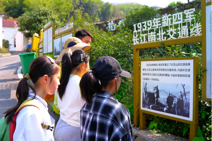 《中华英才》半月刊网安徽讯(俞乃思) 芜湖市繁昌区新四军历史研究会联合孙村镇金岭社区经调研梳理金岭社区红色历史,在省级和美乡村红花中心村设立红色专栏,依托红花山抗日游击根据地红色资源,发挥资政育人作用。图为4月1日,青少年驻足观看红色历史标牌。
