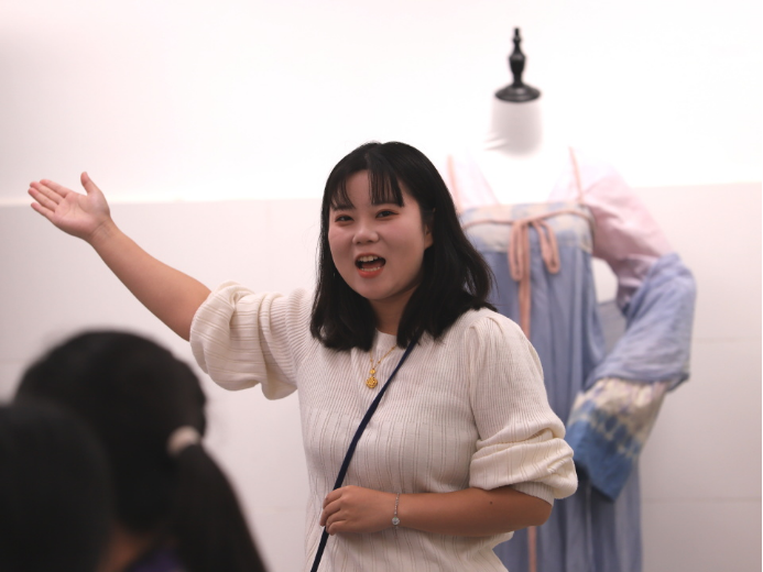 戚梦丽与汪梦靖老师带领大家走入扎染的世界。从靛蓝的故事开始,到亲手折缬、浸染,每一方布巾都在等待独一无二的绽放。蓝与白的交错,是手艺的温度,也是共创的记忆;它浸润着非遗的智慧,也交融着彼此的暖意。