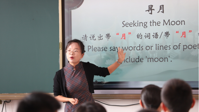 徐文逸老师的双语诗词课,以“月”为线,串起《竹里馆》的幽静、《月下独酌》的洒脱、《望月怀远》的深情。学生们读诗、画月、赠笺,在句句吟诵中感受月亮承载的思念、孤独与美好。当一句句诗词被轻轻念出,那跨越山海的共鸣,已悄然连接起两地的少年心绪。