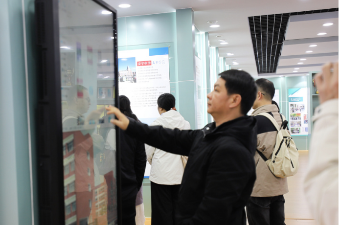 考察团一行参观校本部校史馆并对展板内容进行交互式操作