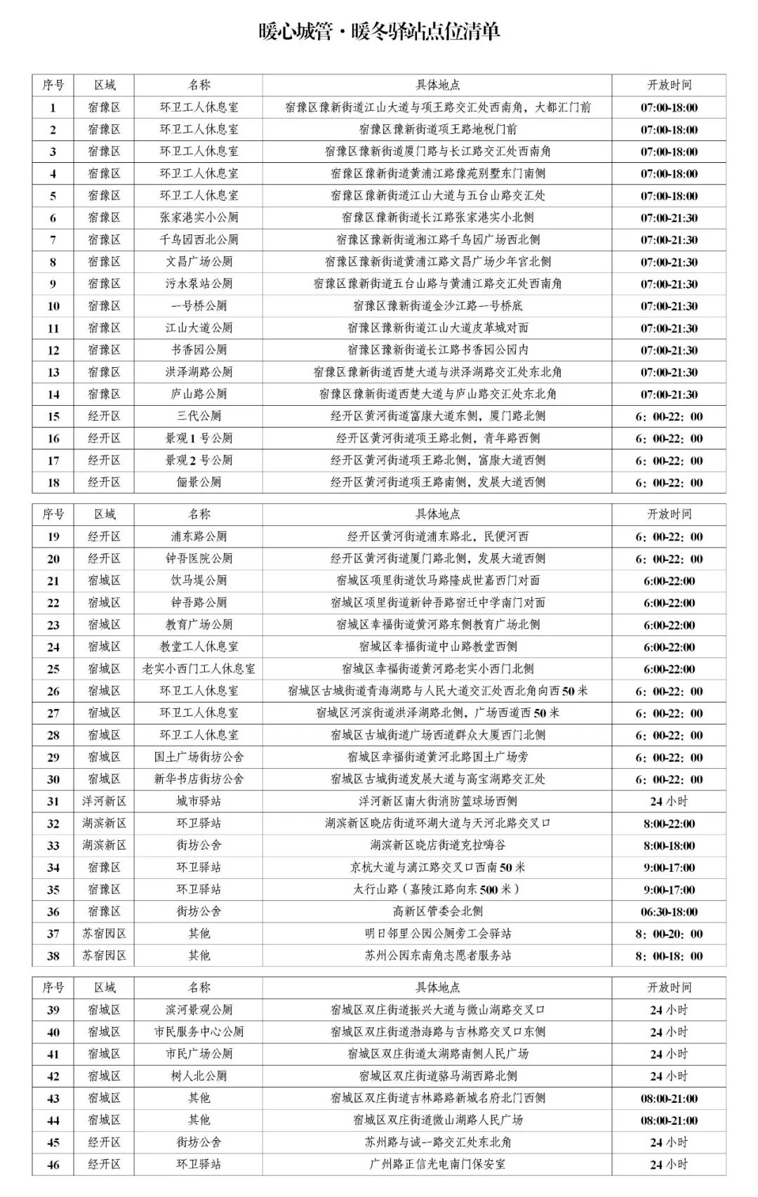“暖冬驿站”均张贴“暖心城管•暖冬驿站”标识,标明开放时间、服务项目及咨询投诉电话,具体点位请看图片。如果您遇到驿站关闭、设施故障等问题,可以拨打咨询电话或给“宿迁城管”公众号留言反映问题。