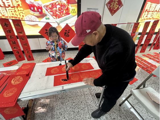 乘客参与互动后便能领取马年定制春联或书法福字,都迫不及待地前往春联书写区领取福利。果然传统墨宝备受大家青睐,车站一隅,长桌铺展,红纸翻飞,书法爱好者现场挥毫泼墨,笔走龙蛇。一副副寓意吉祥、承载祝福的春联,一个个饱满圆润、气韵生动的“福”字在他们笔下流淌而出,瞬间吸引了众多乘客驻足欣赏。不少乘客领到心仪的福礼后,纷纷与春联、福字合影留念,记录这份来自地铁的惊喜,大家喜气洋洋,让福气持续传递。