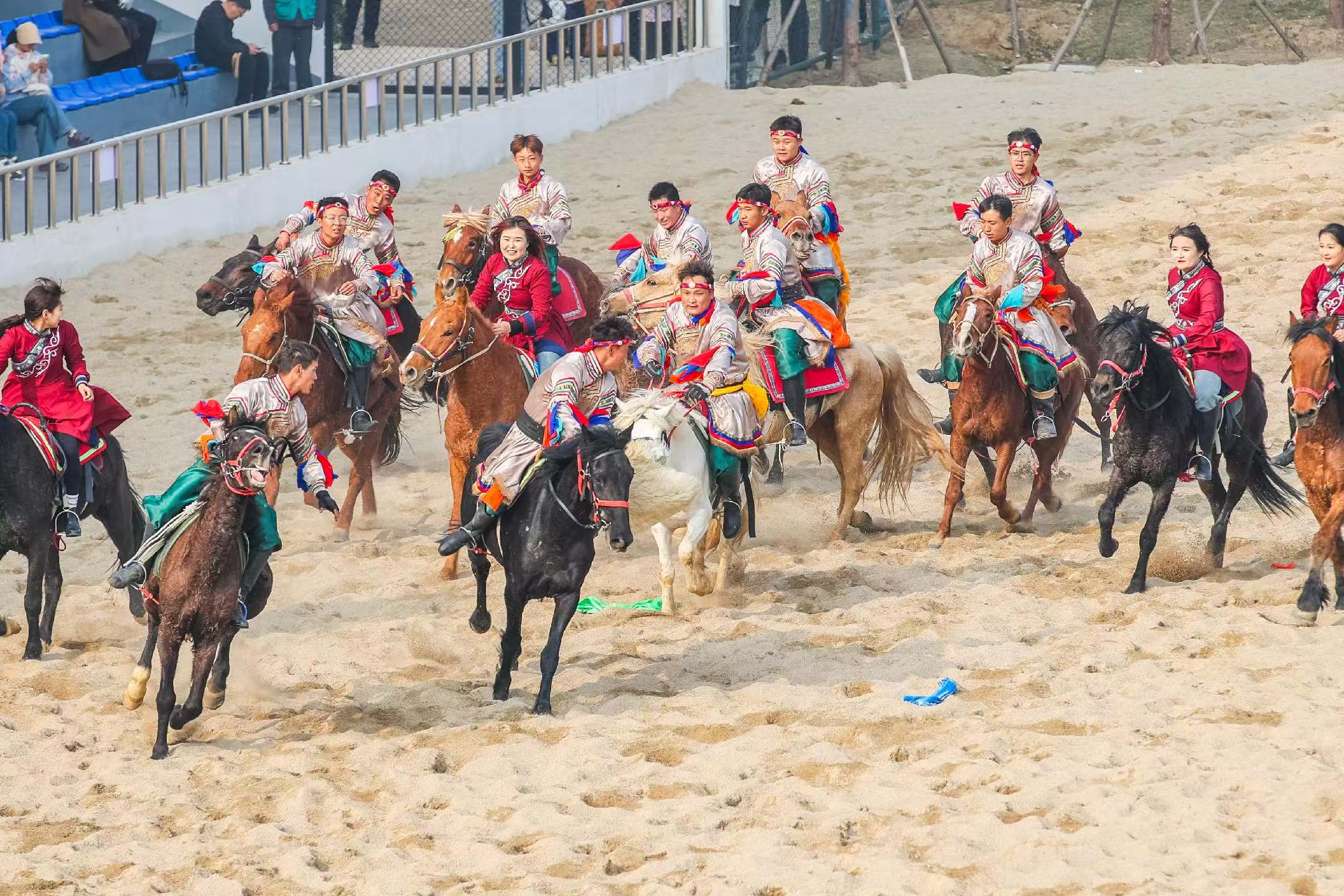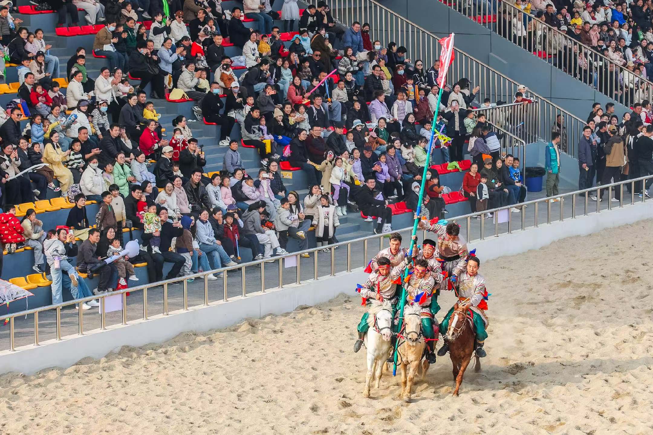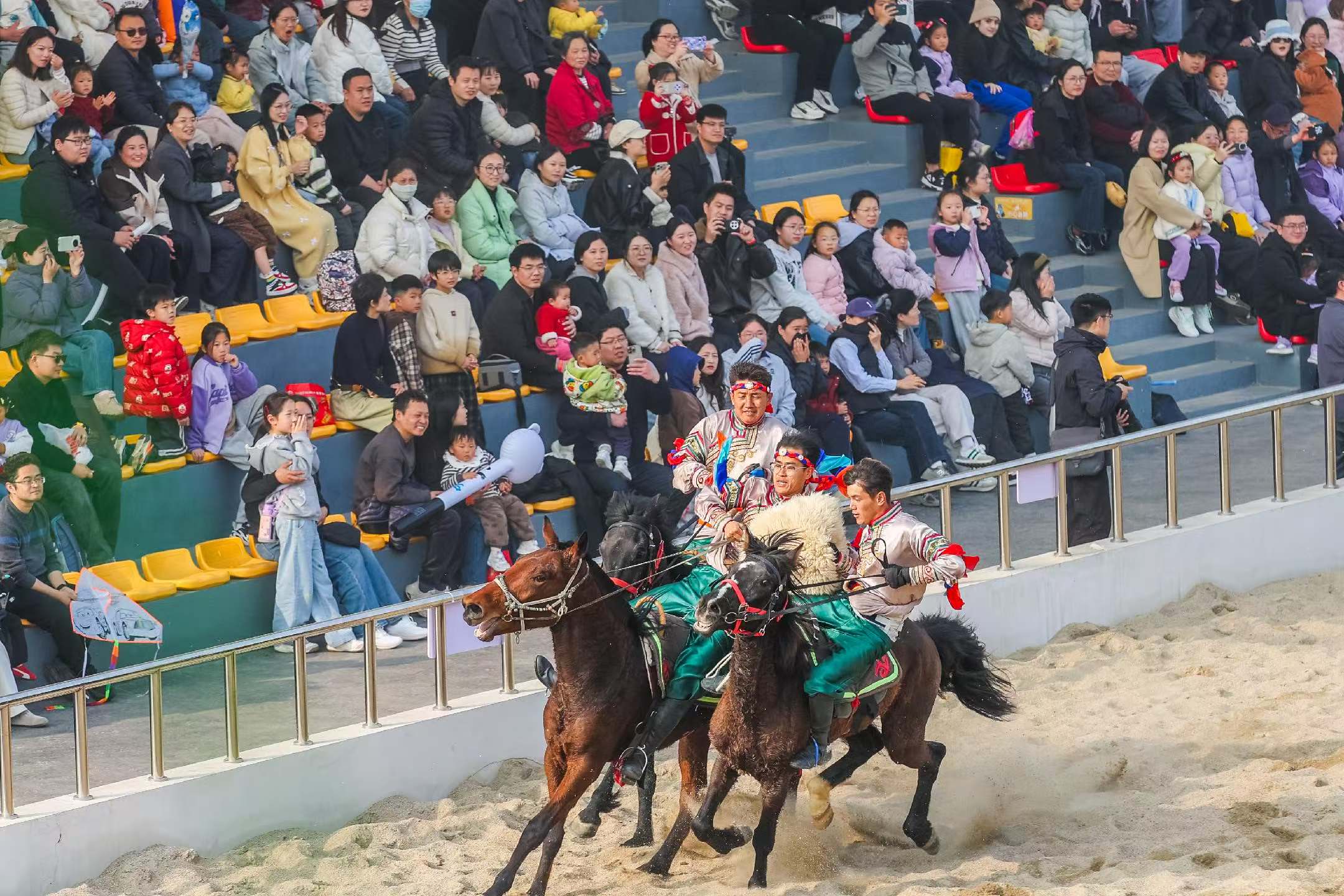 作为宿迁森迪野生动物世界2026年春季重磅推出的演艺项目,《万马奔腾》将内蒙古草原的雄浑气魄“搬”到宿迁。演出以真实骏马为主角,数百匹良驹在森林剧场内驰骋奔腾,场面蔚为壮观。马术表演惊险刺激,骑手在马背上翻腾跃起;骑马射箭英姿飒爽,重现草原民族的骁勇善战;抢羊、无鞍上马等趣味互动环节,则让观众近距离体验草原文化的热情与淳朴。最令人震撼的是演出的压轴大戏——万马奔腾。数百匹骏马如潮水般涌出,马蹄踏起尘土飞扬,将草原的壮阔与生命的奔放展现得淋漓尽致,现场掌声不断。首演当日,近3000名游客涌入森林剧场,现场座无虚席。随着骏马奔腾而出,观众席爆发出阵阵惊呼与热烈掌声。不少游客举起手机记录这震撼一刻,更有家长带着孩子专程从周边城市赶来观看。现场不少观众表示,这样的实景演出在苏北地区十分罕见,值得专程前来打卡。