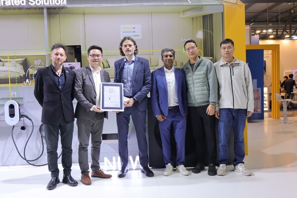 3月24日,国际独立第三方检测、检验和认证机构德国莱茵TÜV大中华区(简称"TÜV莱茵")在2026年意大利米兰暖通制冷及智能家居及卫浴展览会(MCEMILANO)期间,为浙江艾罗网络能源技术股份有限公司(简称"SolaX")旗下ThermalR290系列热泵产品颁发Keymark证书。SolaX欧洲区热泵事业部市场总监赵勇,TÜV莱茵电子电气产品服务区域负责人LucaSangiovanni、大中华区电子电气产品服务技术经理童庆、技术经理郑逸民等双方代表出席了本次活动。
