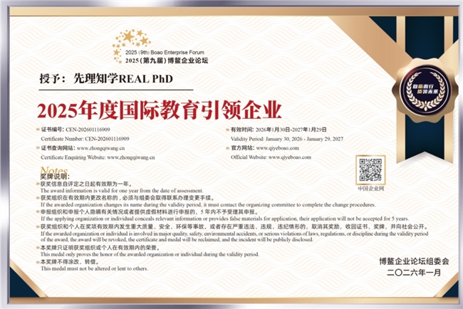 至今,先理知学REAL PhD已助力逾万名中国学子入读海外博士项目。其专业积累也获得广泛认可:新浪&微博教育“2024 年度国际教育领导力品牌”、央广网教育“2024年度影响力留学服务品牌”、福布斯中国“2025留学出国服务卓越品牌”、胡润“年度国际化教育影响力品牌”以及博鳌“2025年度国际教育引领企业”奖项;在国际层面,获BOC Global颁发的“International Brilliance Awards”、IE 100 Awards颁发“International Education Leadership Brand of The Year”奖项,并荣获全球国际教育领域权威机构ICEF认证。