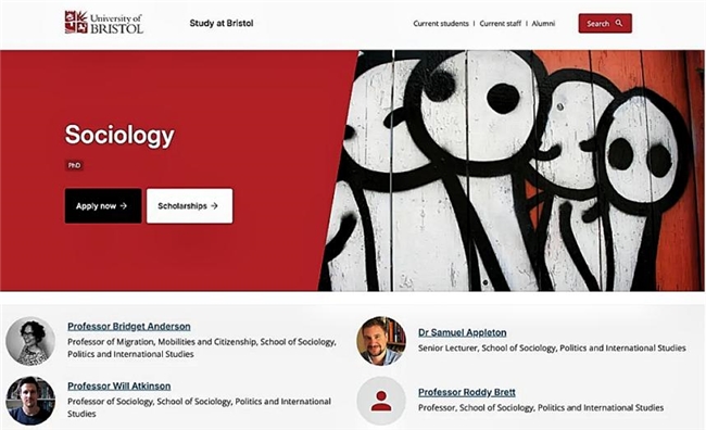 知名院校在选拔申请者时,对学术积累与综合研究能力尤为看重。以英国布里斯托大学社会学的博士项目为例,该校汇集了一批活跃于国际学术前沿的社会学者,其研究涵盖社会不平等、全球移民、数字社会、气候变迁等当代重要议题。布里斯托社会学系以研究主题群(Research Themes)模式组织学术力量,研究方向包括气候与环境危机、数字社会、文化与劳动、去殖民与种族研究等。师资方面,例如Prof. Bridget Anderson、Prof. Will Atkinson等学者在深耕社会学的同时,也活跃于政治学等交叉学科领域,体现出较强的跨学科研究视野。在奖学金支持方面,该校亦提供South-West Doctoral Training Partnership Studentship、University of Bristol Scholarship等项目,为有志于此的申请者提供了重要支持。