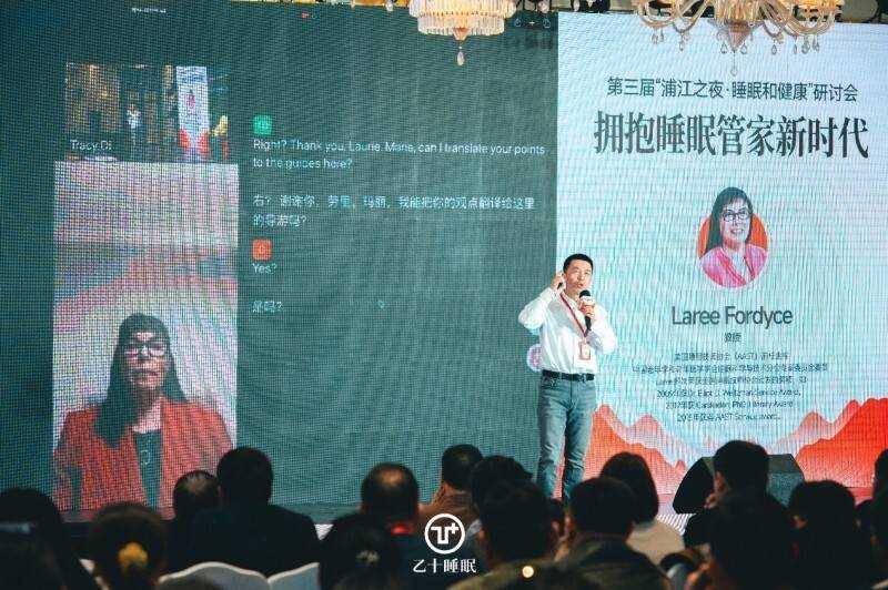 在对话环节,乙十睡眠互联网医院院长于剑扉博士还通过视频连线,与远在加拿大的美国睡眠技师协会前任主席Laree Fordyce围绕“全球视野下的睡眠管理”展开深入交流,并现场解答了观众关于“睡眠管家”的提问。