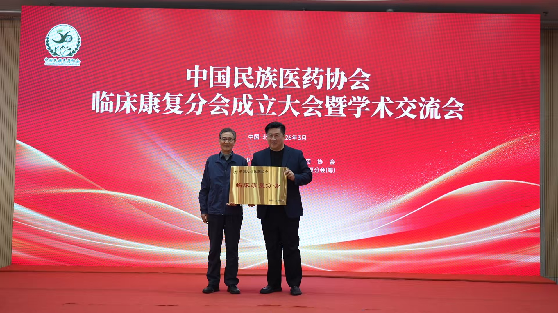 中国民族医药协会会长李文亮(左)为新当选的临床康复分会会长苍建兴(右)授牌