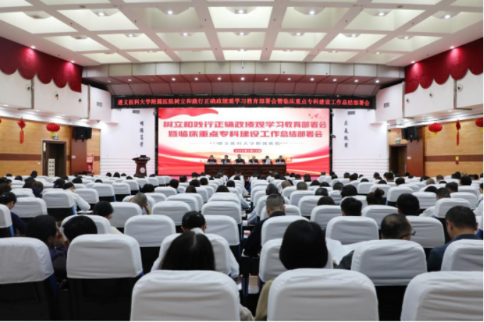 2026年3月13日下午,遵义医科大学附属医院召开树立和践行正确政绩观学习教育部署会暨临床重点专科建设工作总结部署会,传达学习中共中央办公厅《关于在全党开展树立和践行正确政绩观学习教育的通知》要求,部署启动树立和践行正确政绩观学习教育。遵义医科大学党委副书记、附属医院党委书记曾征作讲话,院长余昌胤主持会议,医院领导班子全体成员,各基层党支部书记、支部委员,临床医技科室主任、副主任、护士长、治疗组长,职能部门副科级及以上干部参会。