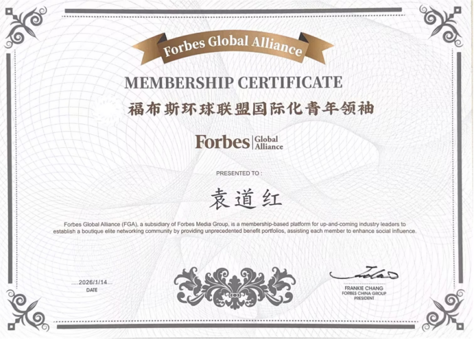 2026年1月,农夫铺子集团董事会主席兼CEO袁道红凭借在商业科技领域的卓越贡献,荣获由福布斯全球联盟(Forbes Global Alliance,简称FGA)正式颁发的“福布斯环球联盟国际化青年领袖”证书。袁道红获此荣誉,标志着其“技术报国,实业惠民”的实践获得了国际权威平台的高度认可,也意味着农夫铺子所代表的中国数实融合创新模式,正走向更广阔的世界舞台。