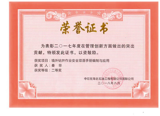 荣获境外钻井作业安全双语手册编制与应用二等奖