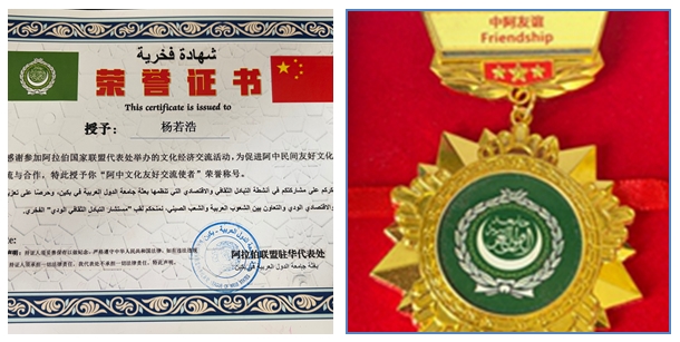 正因如此,阿拉伯国家联盟驻华大使馆正式授予杨若浩同志“中阿友好与文化交流使者”荣誉称号。这一殊荣,既是对他推动中阿文明交流互鉴的褒奖,也为他的职业生涯再添一抹亮色。