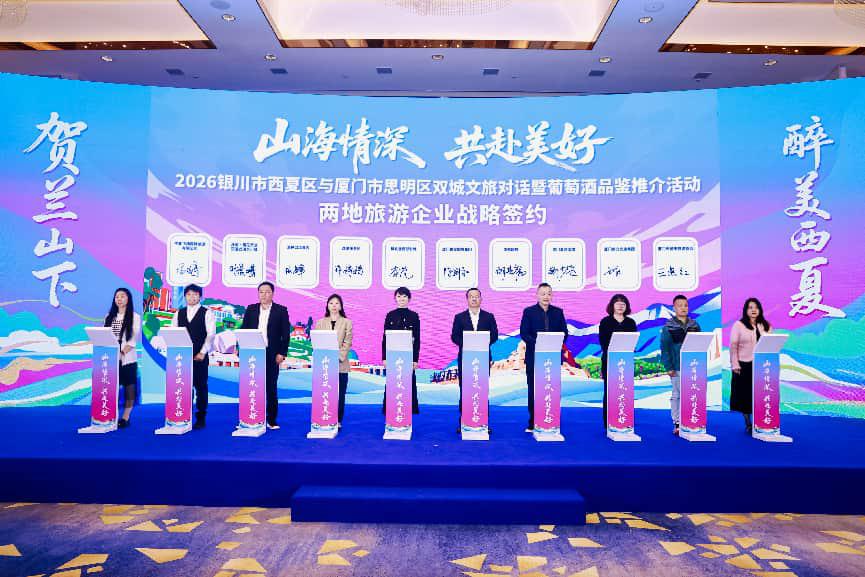 2026年3月6日,由中共银川市西夏区委员会、西夏区人民政府主办的“山海情深 共赴美好——2026年银川市西夏区与厦门市思明区双城文旅对话暨葡萄酒品鉴推介活动”在厦门圆满举行。这场跨越2000余公里的东西文旅交流活动,两地相关部门、行业协会、重点文旅企业等100余人齐聚一堂,共叙山海情谊、共商发展大计、共绘锦绣蓝图。