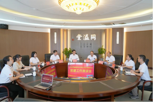 同溢堂党建指导员李荣民与副总裁黄国辉、总经理何贵杰、支部书记俞昌阳及党支部委员、党员代表,围绕党支部党建品牌创建工作深入交流