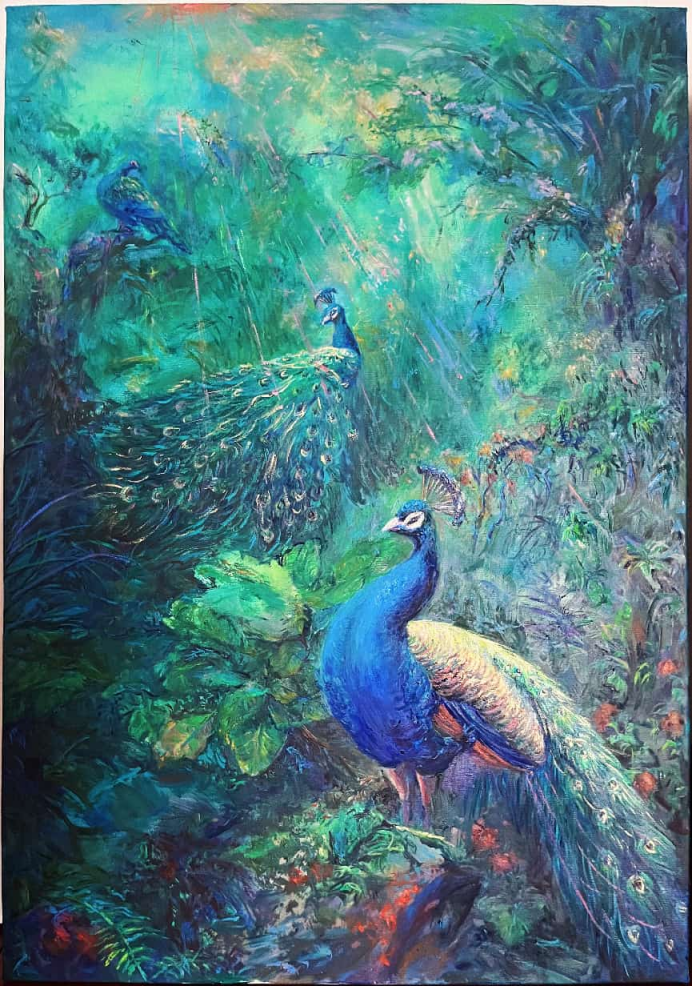 《孔雀翠羽栖林》100x70cm 油画