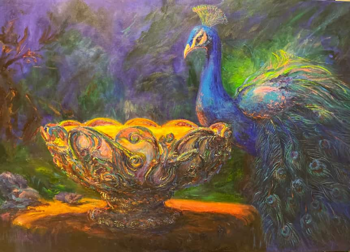 《孔雀抱金碗》 100x70cm 油画