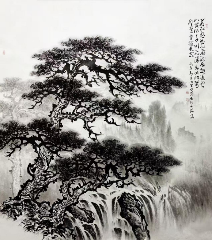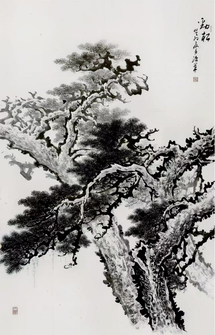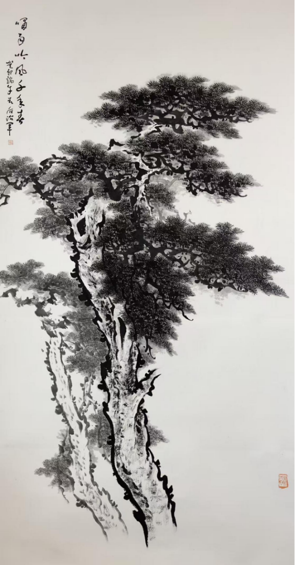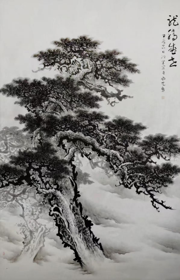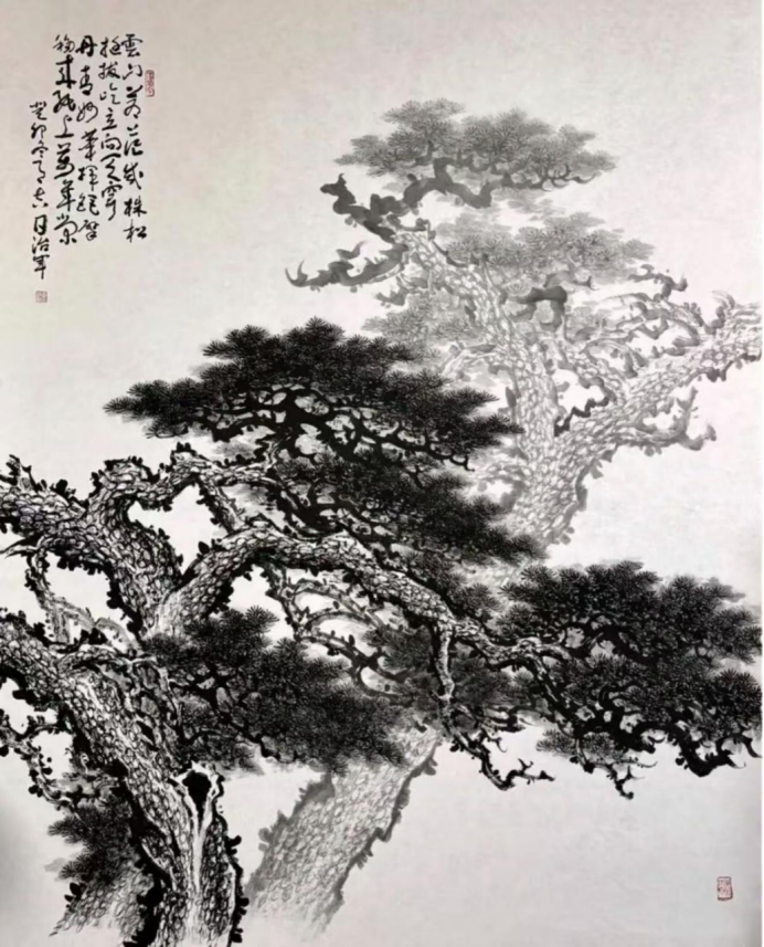 童治军笔下松风苍劲,以铁笔写松骨,以丹心铸艺魂。其作品既承袭传统笔墨精神,又体现时代审美气象,在花鸟画领域尤以画松独树一帜,写尽青松凌风傲骨、浩然正气,将艺术理想与家国情怀融为一体,成为当代中国画坛一位兼具实力与担当的画家。