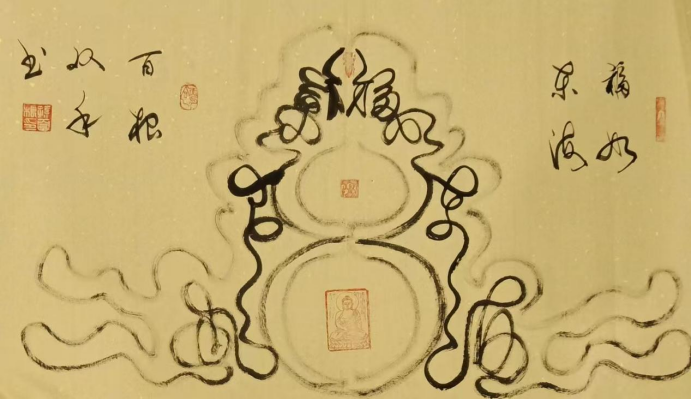 “福如东海”双手象形书法则以葫芦为载体。葫芦在中国传统文化中是福禄吉祥、健康长寿的象征。孙百根将左反右正的“福如东海”四字与葫芦形态、海水奔涌之势相结合,实现形意统一,使书法、葫芦、海水三者高度融合。
