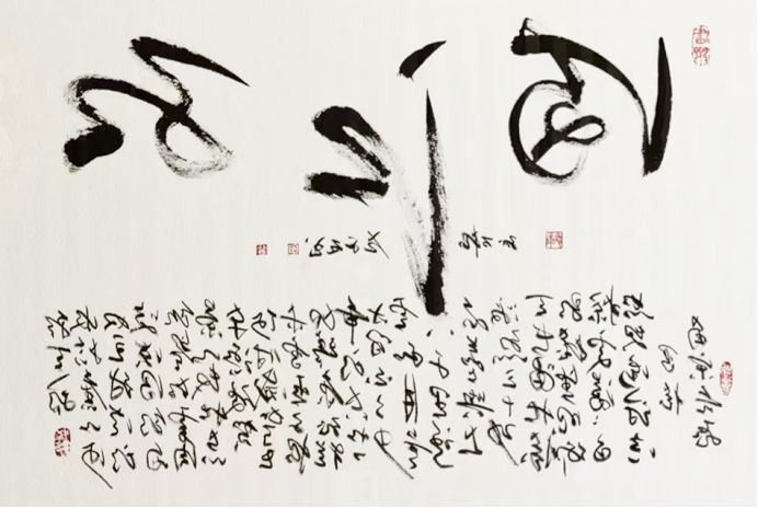 孙百根的作品注重将汉字书写与象形艺术相融合。例如,在创作“马到成功”时,他将四字成语通过左手写反书、右手写正书的形式,融入并驾齐驱的双马造型之中。双马象征速度与力量,既保留成语迅速成功的表意,又赋予作品视觉上的文化内涵。字与字之间通过笔断意连呼应,中锋与侧锋并用,点、顿、挫及枯笔飞白,表现出马的奔驰感与飘逸灵动。