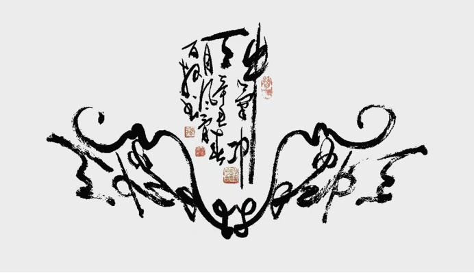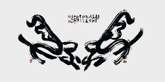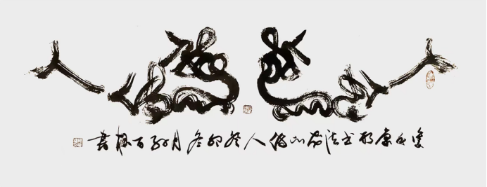在“龙的传人”双手象形书法创作中,他将四字融入双龙造型,利用汉字本身的象形特征与龙形的视觉元素,使文字与图案浑然一体。以右反左正的“龙”字为视觉主题,采用草书象形结构,将“的”“传”“人”三字巧妙嵌入或变形于双龙的身体、手爪、尾部,整体布局体现“阴阳和合,生生不息”的民族精神。