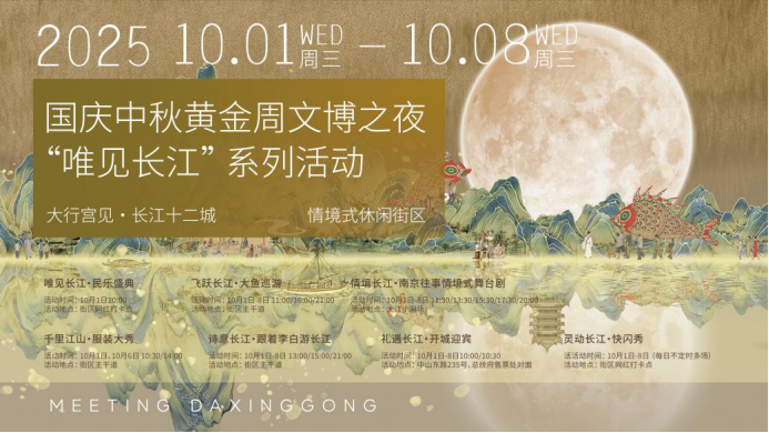 双节期间,街区将以“礼遇长江·开城迎宾”古风仪式迎接市民游客,展现南京作为长江文化名城的历史底蕴与现代活力。将推出七大主题系列活动:唯见长江·民乐盛典、千里江山·服装大秀、飞跃长江·大鱼巡游、诗意长江·跟着李白游长江、情忆长江·“南京往事”情境舞台剧、礼遇长江·开城迎宾、灵动长江·快闪秀”等。活动形式涵盖大型演艺、巡游互动、戏剧演出、时尚秀场、街头快闪等,充分体现“文化+旅游+体验”的深度融合。