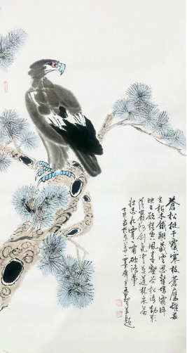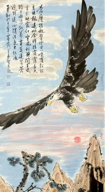 雄鹰昂首远眺的姿态,向观者传递出一种超然物外的孤高气质。悬崖之险、松树之坚,共同构筑了一个充满禅意的场景,暗喻着“高处不胜寒”的哲思。