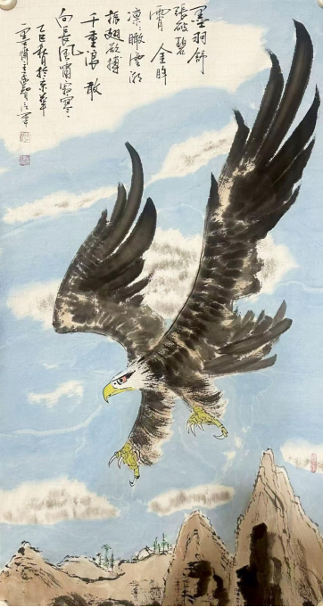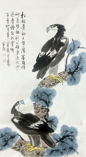 这种以书入画的方式,使他笔下的鹰超越了物象再现的层面,背景的渲染采用泼墨手法,营造出朦胧而宏大的空间感,这种古今交融的表现方式,既保留了水墨画的古典韵味,又赋予其新的时代气息。先生的高妙之笔,甚为收藏家们钟爱。