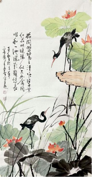 在构图上,李孟智打破了传统折枝荷花的程式化布局。其作品常以书法中“计白当黑”的理念经营空间,作品中,墨荷与空白处形成强烈的虚实对比,而鹭鸟的留白处理更显高明,仿佛米芾“无画处皆成妙境”的审美主张的当代演绎。这种对空间节奏的把握,既源于其对王羲之《兰亭序》章法的参悟,又展现出画家对现代构成意识的敏锐感知。
