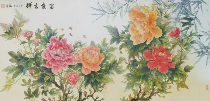 她的色彩运用更彰显出古今融合的智慧:在继承传统中国画淡雅基调的同时,大胆融入岭南画派妍丽明快的设色特点。牡丹的华贵、荷花的清逸、木棉的炽烈,在她笔下既保持自然本色,又被赋予装饰性的美感,形成“色调妍丽而典雅”的视觉特质。这种对色彩的革新,使作品在当代展厅中焕发出强烈的视觉感染力。
