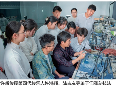 某次院校所开设的“动态力学与玉雕”课程,看着他们用激光雕刻机在玉石上进行的试验性创作。许新顿生隐忧:科技能解决雕刻的精度问题,但永远无法替代玉石与匠人指间的温度感应。想起恩师当年对许新“惜玉如命”的训诫,许新认为当务之急是要让硬玉悬空雕这门指间匠艺传承光大。