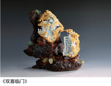 硬玉摩氏硬度达6.5-7,其刚烈本性注定与“悬空”二字背道而驰,因此其创作过程充满考验。许新深知“失败是成功之母”,艺术追求的路上唯有百折不挠。在构思作品时选用水色俱佳的原料,在创作时就逼着自己另辟蹊径,并以精妙恰当的设计使其缺点变成亮点。于是创作出了《黄山揽胜》《双喜临门》《祥安永结》《君子长青》等作品,其中《黄山揽胜》获得玉雕界公认最高奖项“天工奖”。其作品成为当代中国玉雕界瞩目公认的艺术精品。