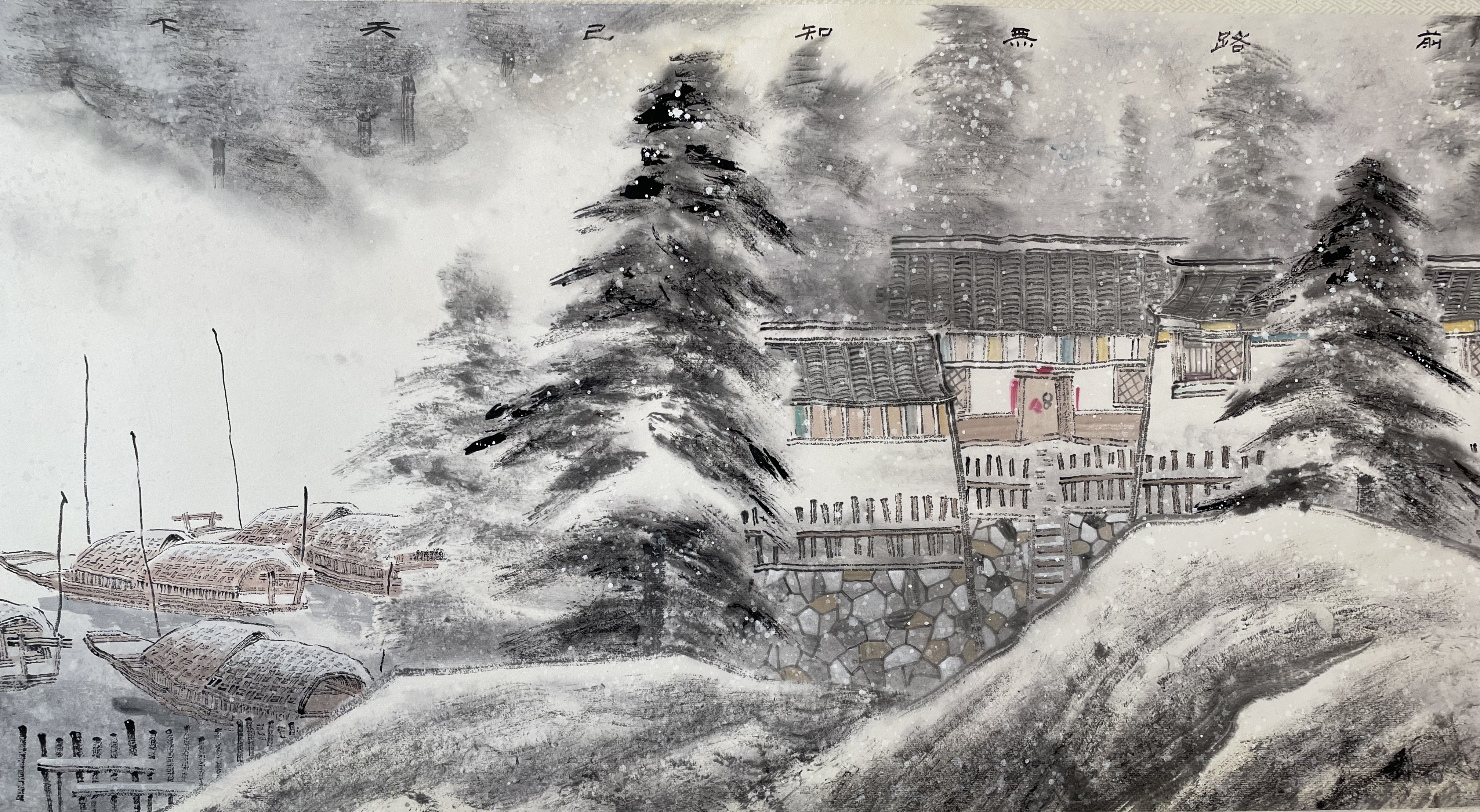 更令人动容的是,李玉国并未止步于对传统的复刻,而是将当代文人的禅意思考注入创作内核。他以留白为载体,在虚实相生的画面中融入禅意哲思——白雪覆盖尘世喧嚣,留白承载内心澄澈,笔墨间既有自然雪景的静谧之美,更有文人“物我两忘、心向宁静”的精神追求。这种创作手法,既延续了传统雪景画的古典韵味,又赋予作品当代艺术的视觉张力与思想深度,让宋元风骨不再是遥远的艺术符号,而是与当代禅意文人精神相撞相融,成就了“古意今韵”的独特艺术表达,为观众呈现出一场兼具审美价值与精神内涵的视觉盛宴。