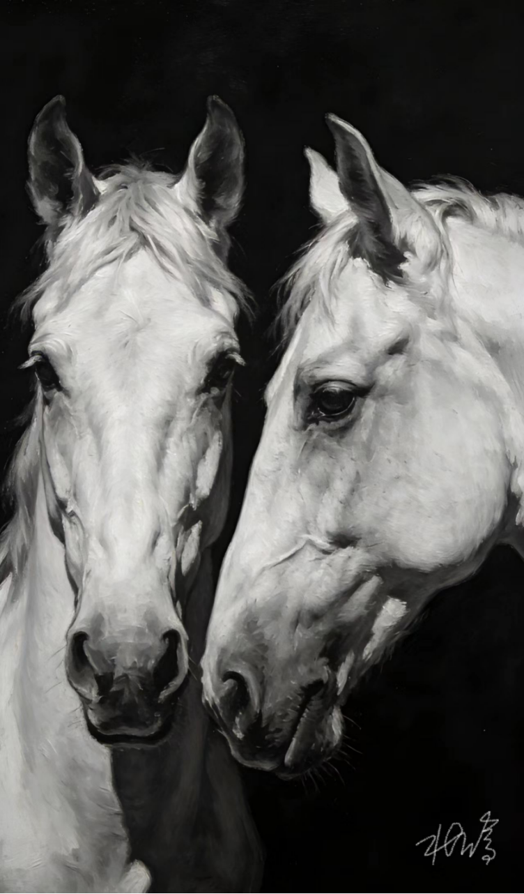 北鸿的超写实油画绝非对现实的机械复刻,而是通过极致技术实现“物象的神化”。在马题材创作中,这一特质尤为显著。在《骏马》《汗血宝马》等作品中,北鸿以多层透明色釉技法刻画马匹鬃毛的纤维感、皮下血管的脉络起伏。这种“显微镜下的真实”不仅延续了冷军式的技术理性,更注入了道家“观物取象”的哲学。马匹既是生物学意义上的生命体,更是“龙马精神”的文化符号,在肌理中暗含《周易》“乾卦”的刚健气象。