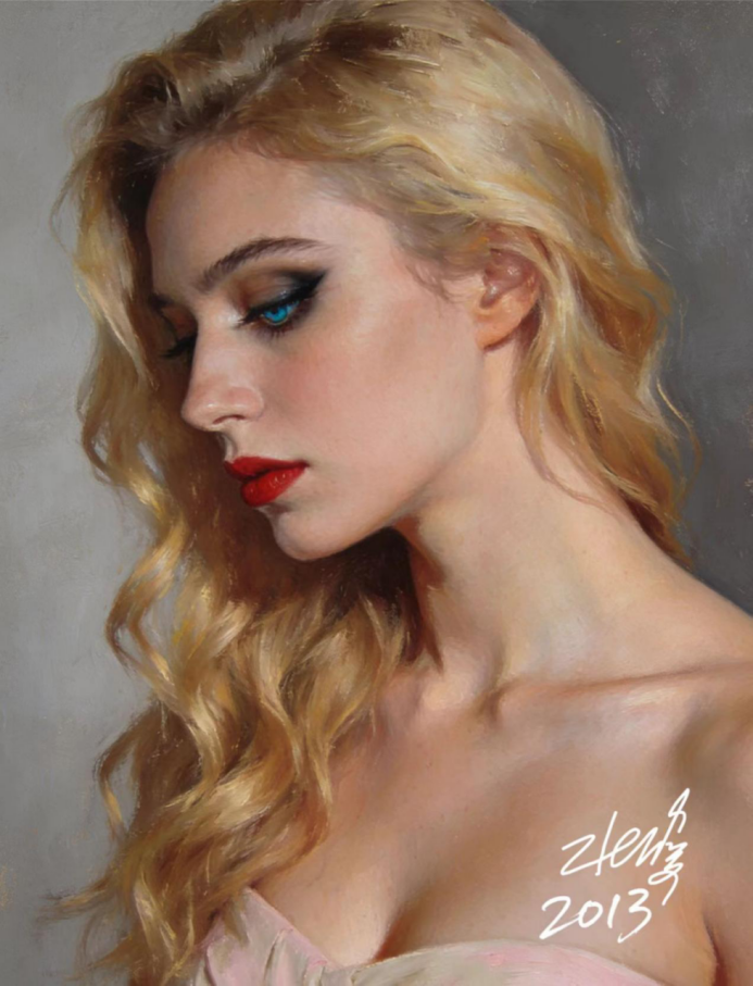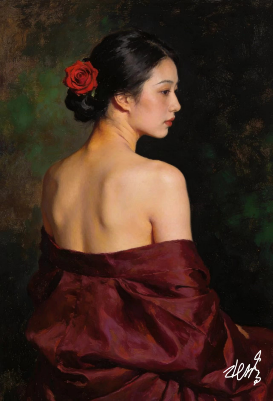 在人物肖像《南雁》中,北鸿进一步展现了显微级生命律动的捕捉能力。画家以超写实技法直面人物面容,细腻的笔触与温暖色彩捕捉沉思的瞬间。眼眸中的光晕与肌肤质感被赋予显微级的刻画,情感如液态月华般可感,在静谧中涌动思绪的河流。艺术语言臻于极致抽象,剥离色彩后仅以黑白与侧光雕塑轮廓。薄纱裙裾的透明质感被光影勾勒,身体的诗意升华为仪式性存在,在极简中抵达精神的显影。北鸿革新了西方古典油画的单一光源传统,将伦勃朗的戏剧性用光与北宋山水画的“三远法”结合。
