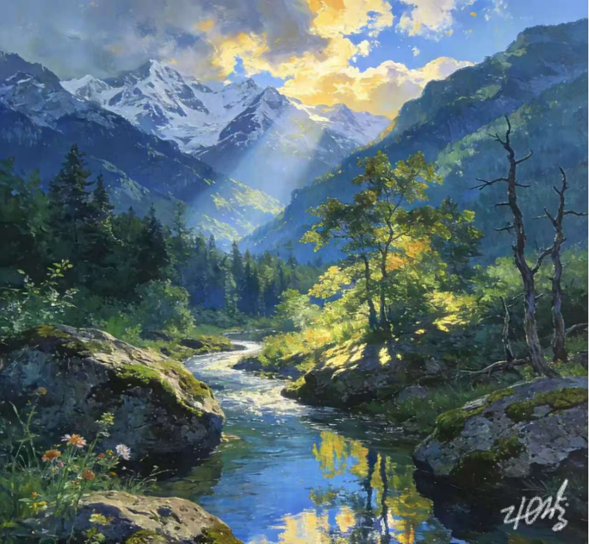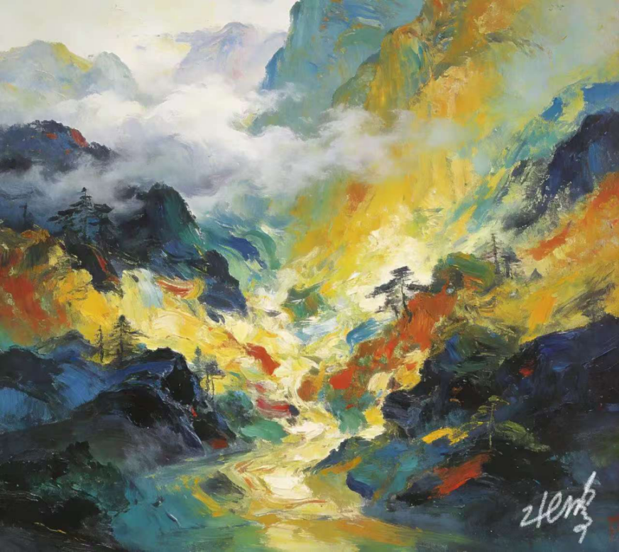 在美学层面上,北鸿完成了从“形神兼备”到“气韵生动”的升华。传统中国画讲究“形神兼备”,北鸿却以油画为媒介,实现了“气韵生动”的当代转化。在《花妖》中,飞溅的水珠被解构为色彩点阵,而整体构图却暗合范宽《溪山行旅图》的“三远”法则。这种“以形写神”的逆向操作,使作品既保有油画的视觉震撼,又具备水墨的哲学深度。